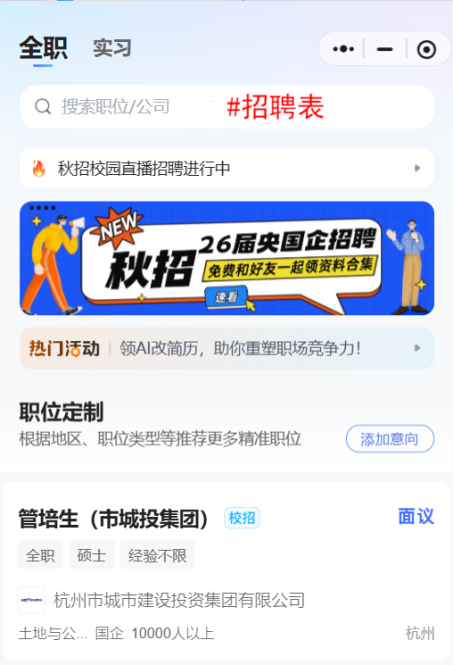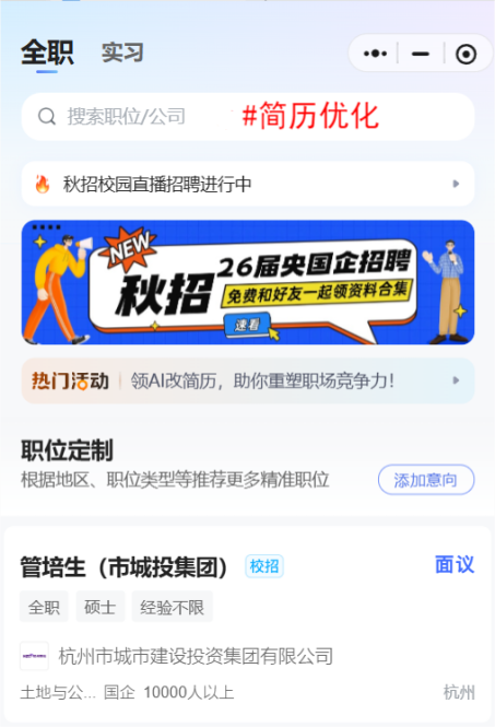 領(lǐng)取方式二:搜索“智聯(lián)校園”微信小程序,在微信小程序中搜索“#簡(jiǎn)歷優(yōu)化”,即可獲取免費(fèi)AI改簡(jiǎn)歷權(quán)益;不同平臺(tái)關(guān)鍵詞不一致,關(guān)鍵詞一定要帶“#”。