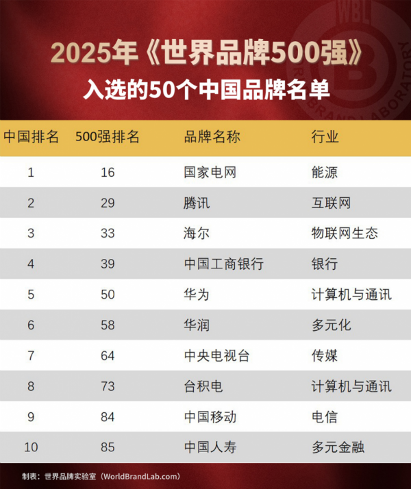 12月17日,世界品牌實(shí)驗(yàn)室正式發(fā)布2025年度(第二十二屆)《世界品牌500強(qiáng)》榜單。國家電網(wǎng)、騰訊、海爾、中國工商銀行等50個中國品牌入選,總數(shù)超越日本,穩(wěn)居全球第三,展現(xiàn)出中國企業(yè)不斷提升的全球競爭力。其中,海爾已連續(xù)22年上榜,位列全球第33名,并穩(wěn)居中國品牌前三。
