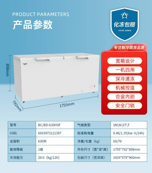 作為針對大生意場景的旗艦產品,澳柯瑪BC/BD-630HSF以寬體設計重新定義存儲邊界。其外形尺寸達到1755*792*898毫米的黃金比例,超寬箱體打破傳統(tǒng)冷柜存儲限制,無論是整箱海鮮、大塊肉食,還是整張貂皮等特殊物品,都能實現(xiàn)隨心擺放。大容量設計搭配均勻制冷系統(tǒng),確保食材凍得透、存得多,徹底解決商戶旺季存儲壓力,滿足批量備貨需求。